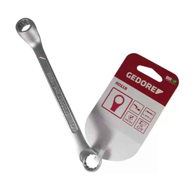 Chave estrela fabricada em aço cromo- vanádio Gedore red. Acabamento niquelado e cromado. Pescoço longo, cabeças inclinadas, parede fina e medidas diferentes em cada extremidade.